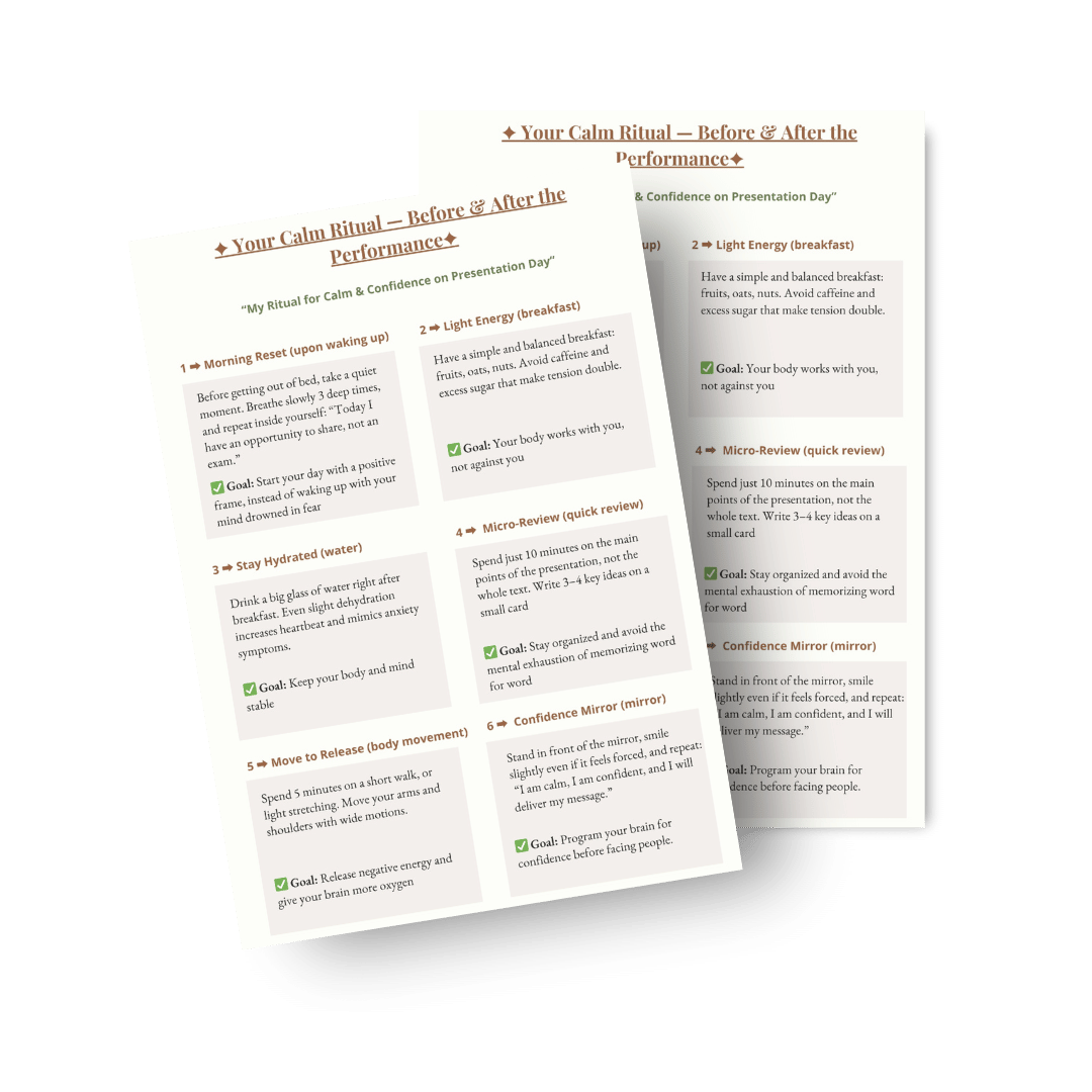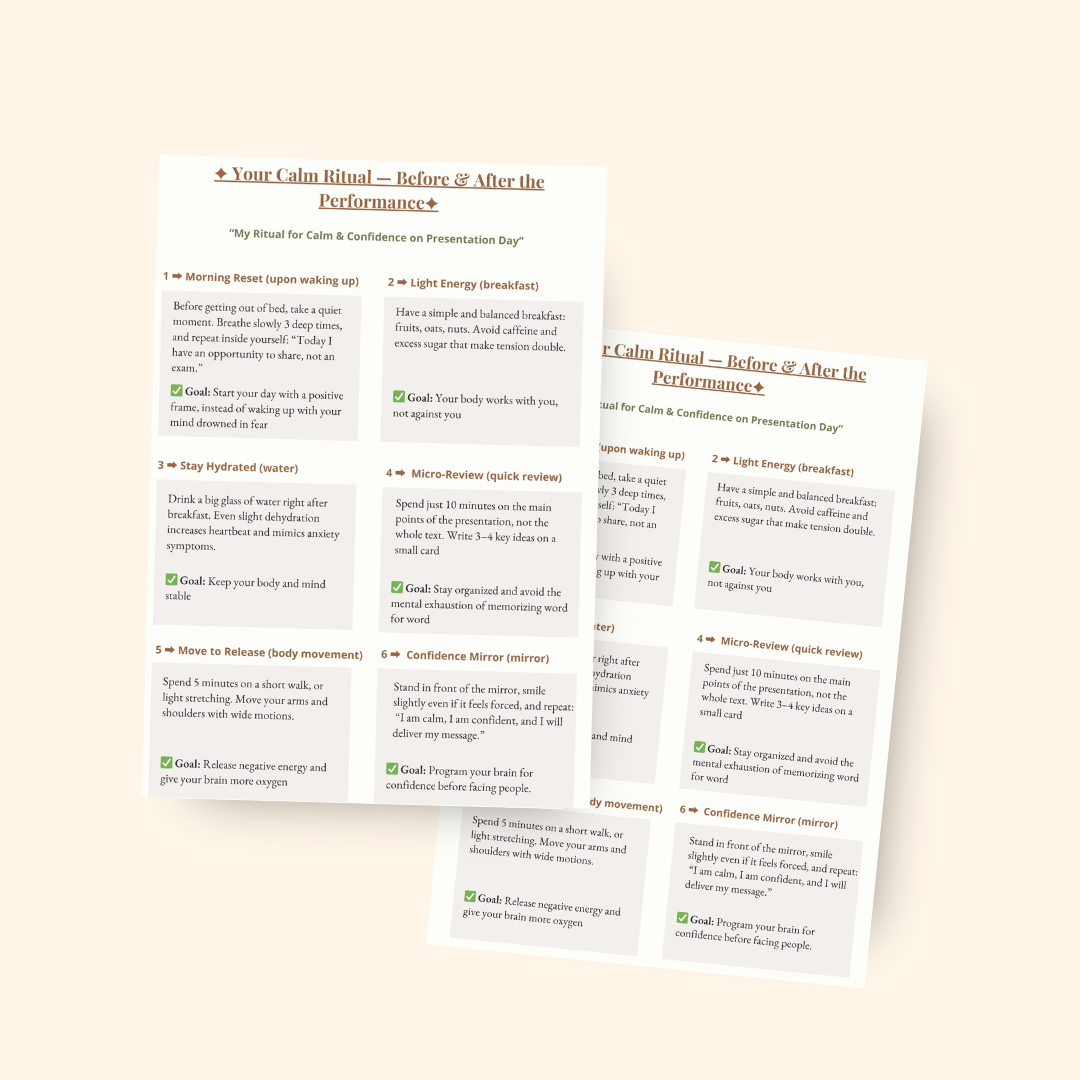 Most guides talk about theory — this one trains your body. Each tool is short, practical, and designed for real moments like meetings or presentations.